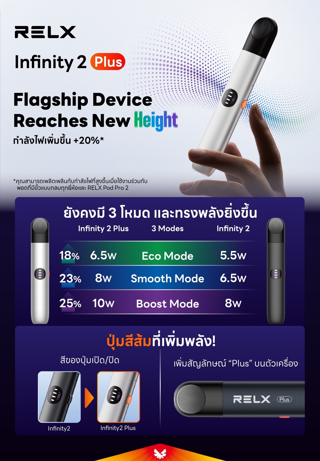 แต่การอัปเกรดครั้งนี้ทำให้มันโดดเด่นเหนือกว่ารุ่นก่อนหน้าอย่าง RELX Infinity 2 และเหมาะสำหรับผู้ที่ต้องการฟังก์ชั่นที่ปรับแต่งได้มากกว่าจากพอตรุ่นก่อนหน้า ด้วยการชนะรางวัล Vapouround Global Award Best Closed Pod System ประจำปี 2024 จึงยืนยันถึงคุณภาพของ RELX Infinity 2 Plus และทำให้มันเป็นตัวเลือกที่ยอดเยี่ยมสำหรับคนที่ต้องการประสบการณ์การสูบพอตที่ดีที่สุดในตอนนี้จาก Relx คุณจะไม่ผิดหวังเลย!